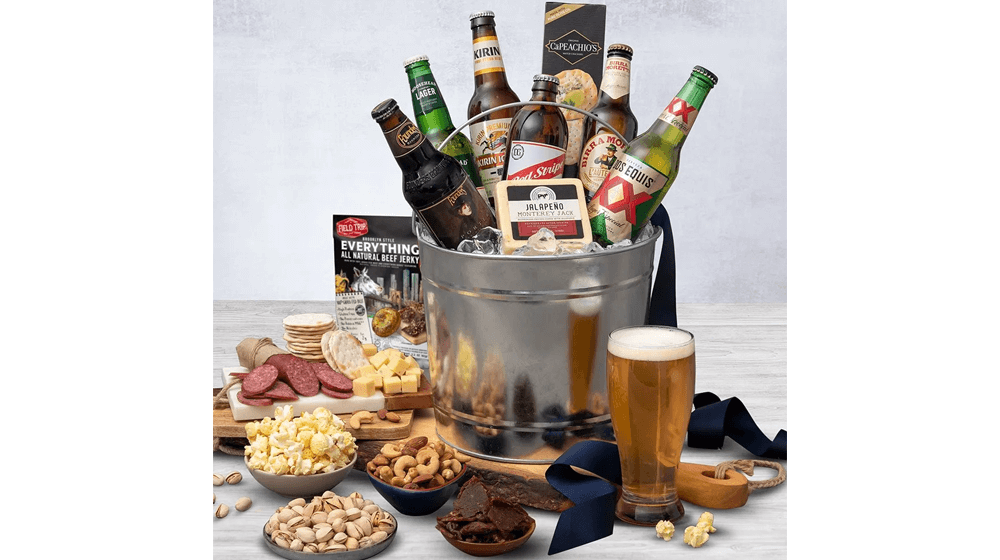 Send cheer from around the world! The Around the World Beer Bucket features six beers from six different brewers and snacks inside a reusable galvanized steel bucket.