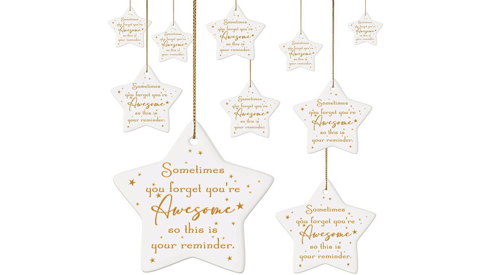 Ornaments also make great Thanksgiving gifts – many people put their holiday decorations up on Thanksgiving Day. This is a set of 10 ceramic star ornaments with an affirmation on them -perfect for employees and/or clients!